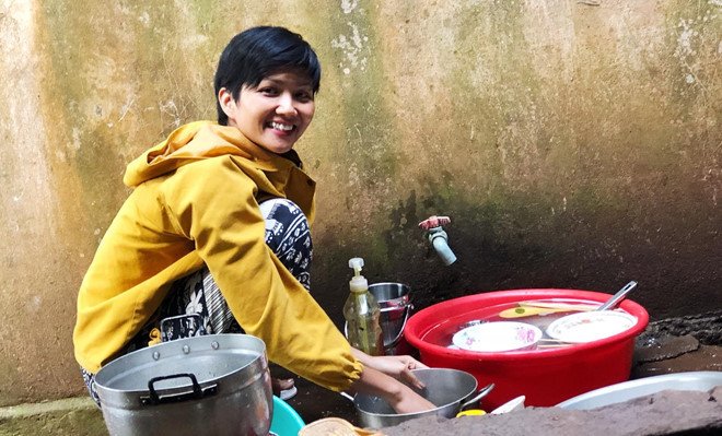H'Hen cười tươi khi đang ngồi rửa bát.