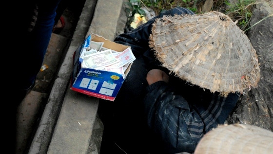 | Người thanh niên này hoàn toàn khỏe mạnh nhưng vẫn giả bộ ốm yếu để xin tiền. Khi thấy PV chụp ảnh anh ta đã kéo chiếc nón che mặt lại. |