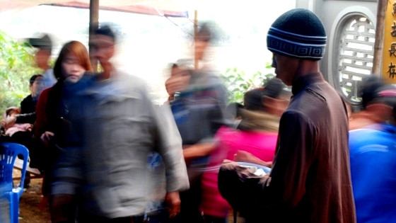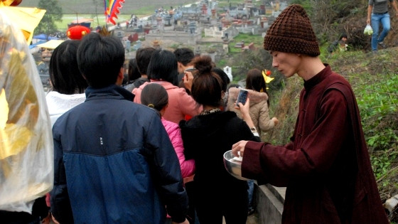| Một số người mặc áo tu hành xuất hiện để nhận bố thí của khách thập phương. |