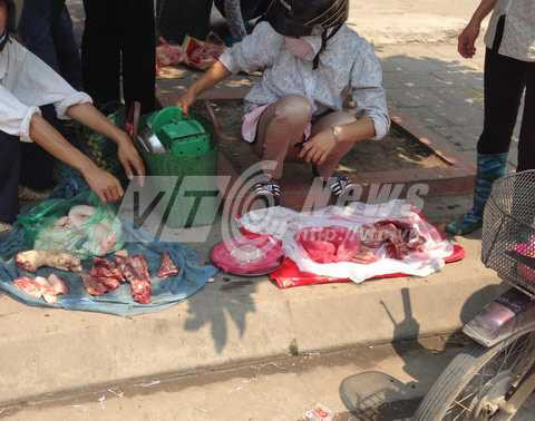 Theo quan sát, các mặt hàng thịt ở đây được bầy bán hết sức mất vệ sinh, chỉ gồm một tấm ni lông hoặc vỏ bao là đã có ngay một gian hàng nằm sát lề đường.
