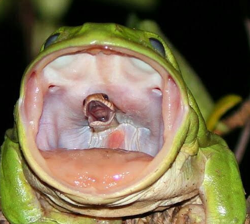 Bức ảnh được đăng trải trên Reddit ngày 16/10 với tiêu đề “Tiếng thét cuối cùng từ vực sâu” cho thấy con rắn đang bị một con ếch xanh lớn nuốt chửng. Điểm đặc biệt là bức ảnh canh được khoảnh khắc chuẩn nhất khi hai con vật cùng mở miệng.