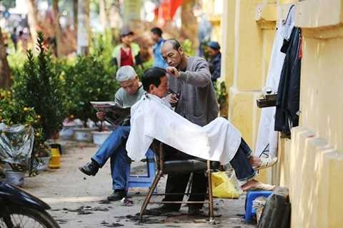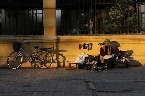 Nắng mới xiên khe trên phố Lý Thường Kiệt. Một cụ già ngồi chờ khách sửa chữa giày dép.