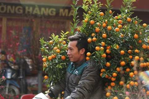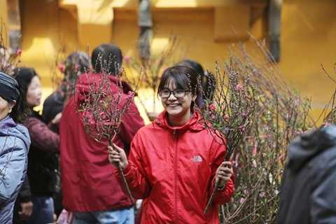 Một cô gái tranh thủ kiếm thêm bằng công việc đi bán cành đào ở phố Hàng Lược, quận Hoàn Kiếm.