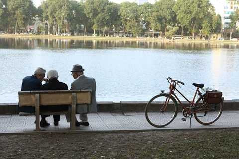 Các cụ cao tuổi ngồi hàn huyên bên ghế đá hồ Thiền Quang.