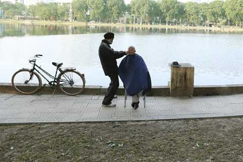 Hai ông cụ tự cắt tóc cho nhau bên hồ.