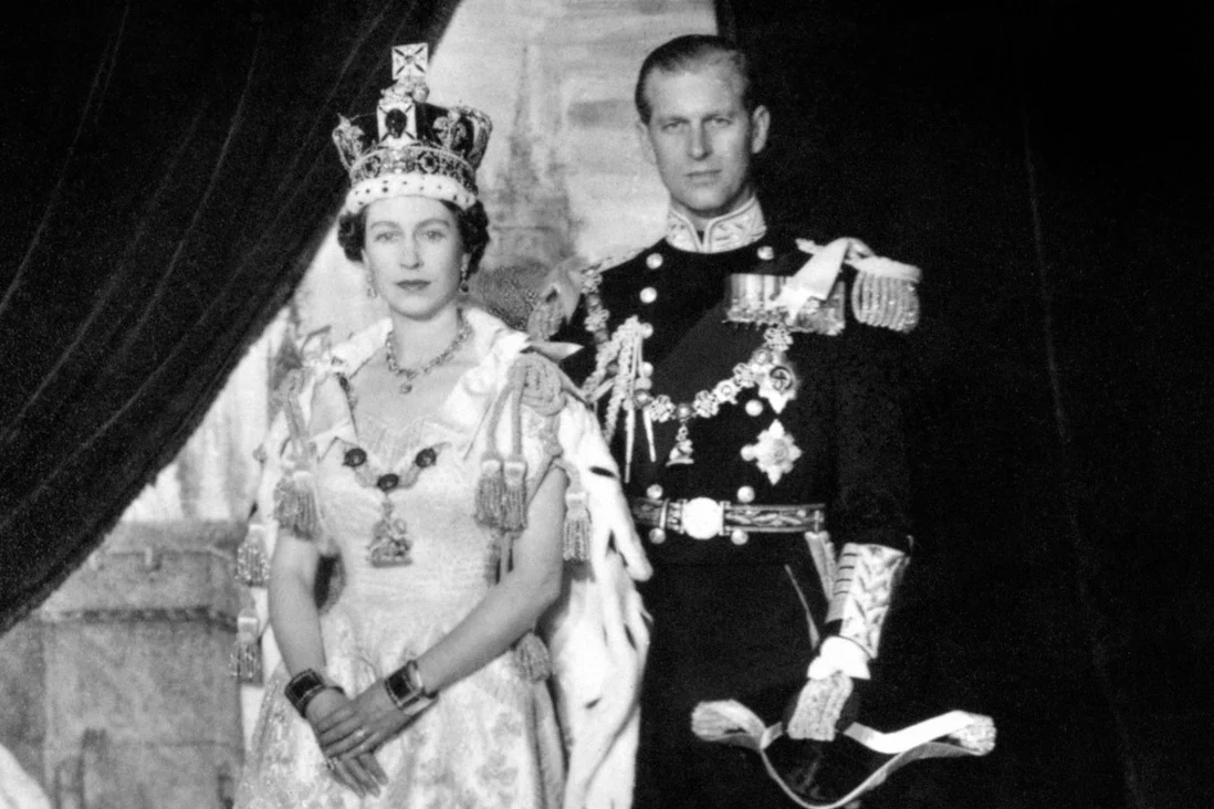 Nữ hoàng Elizabeth II, đội vương miện và khoác áo choàng trong ngày đăng quang, cùng Hoàng thân Philip, tại cung điện Buckingham, London. (Ảnh: Getty Images)