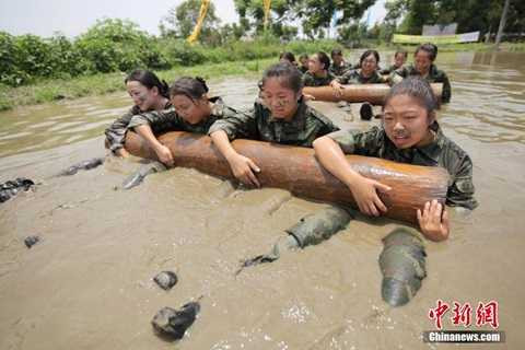 Dưới nắng hè như đổ lửa, các cô gái trẻ măng thực hiện các bài tập rất nặng như bê gỗ, đưa thân gỗ đi qua vũng nước đục ngầu hay tập các thể võ dưới nước...