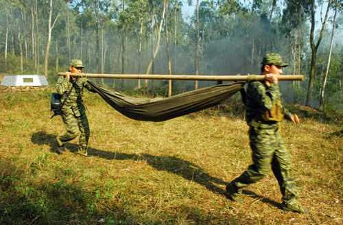 Tiến hành vận chuyển “thương binh” về các tuyến quân y bằng võng.