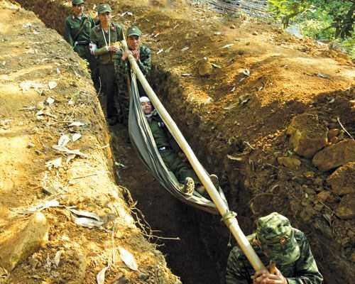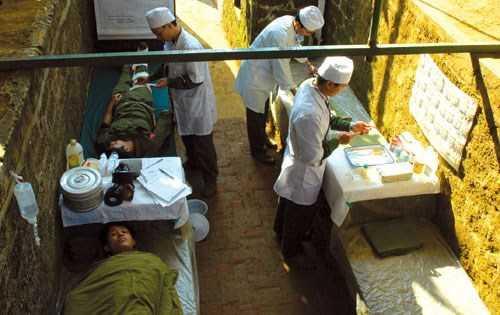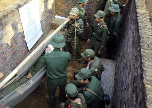 Thương binh” được cấp cứu dưới giao thông hào và chuẩn bị vận chuyển về tuyến sau.