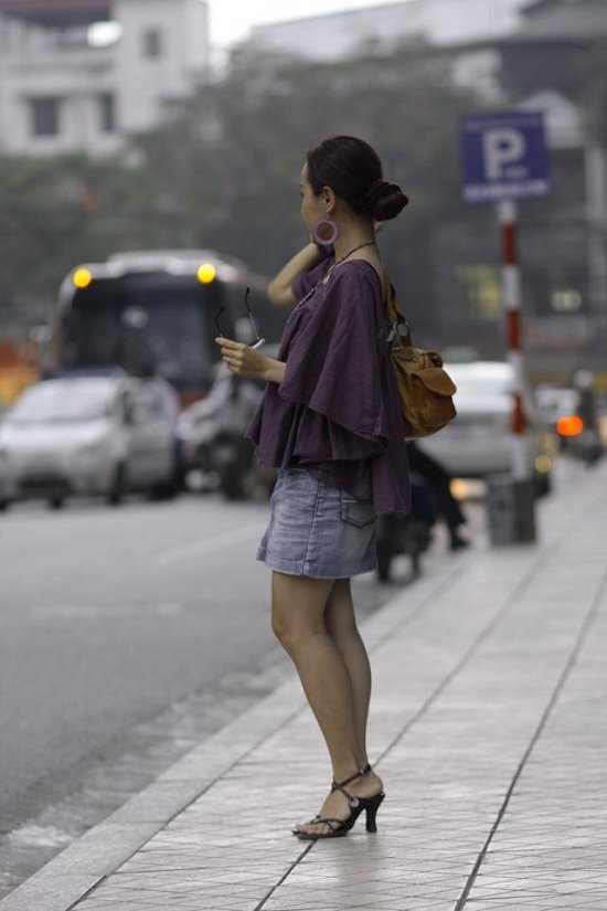 Hoài Anh mặc một bộ trang phục rất thời trang và ấn tượng khi lên sóng Bản tin 22h30, nhưng ở dưới thì cô đang đi chân đất. |