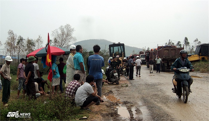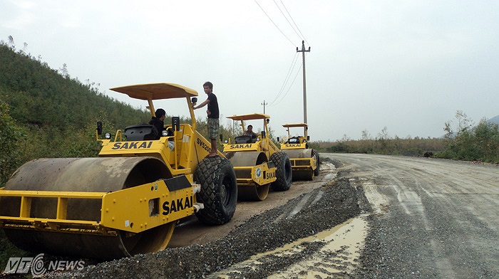 Con đường dẫn tới khu an táng được thi công cấp tốc nhưng do trời mưa to suốt nhiều ngày qua nên các đơn vị thi công vẫn túc trực để xử lý sự cố