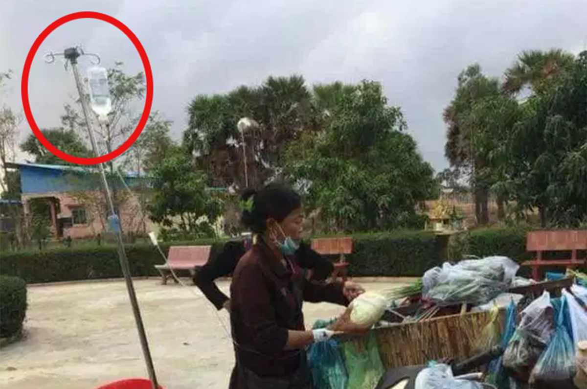 Trong bức ảnh được chia sẻ, người phụ nữ chăm chú vào công việc đang làm. Điều đáng chú ý nhất là người này đang cắm kim truyền trên tay. Không màng đến đau ốm, mệt mỏi, hay sự vướng víu của chai truyền đằng sau, người phụ nữ vẫn chăm chỉ làm việc.