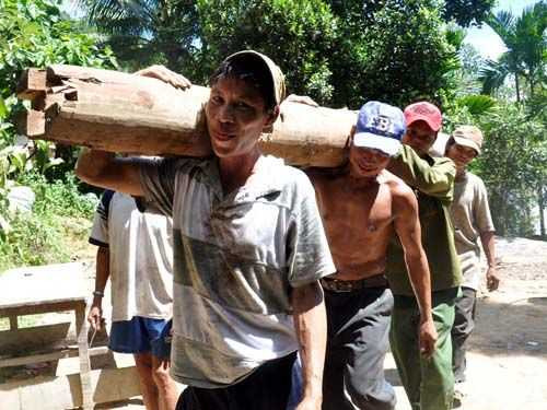 | “Người rừng” Hồ Văn Lang tham gia khuân vác các vật dụng xây nhà. |