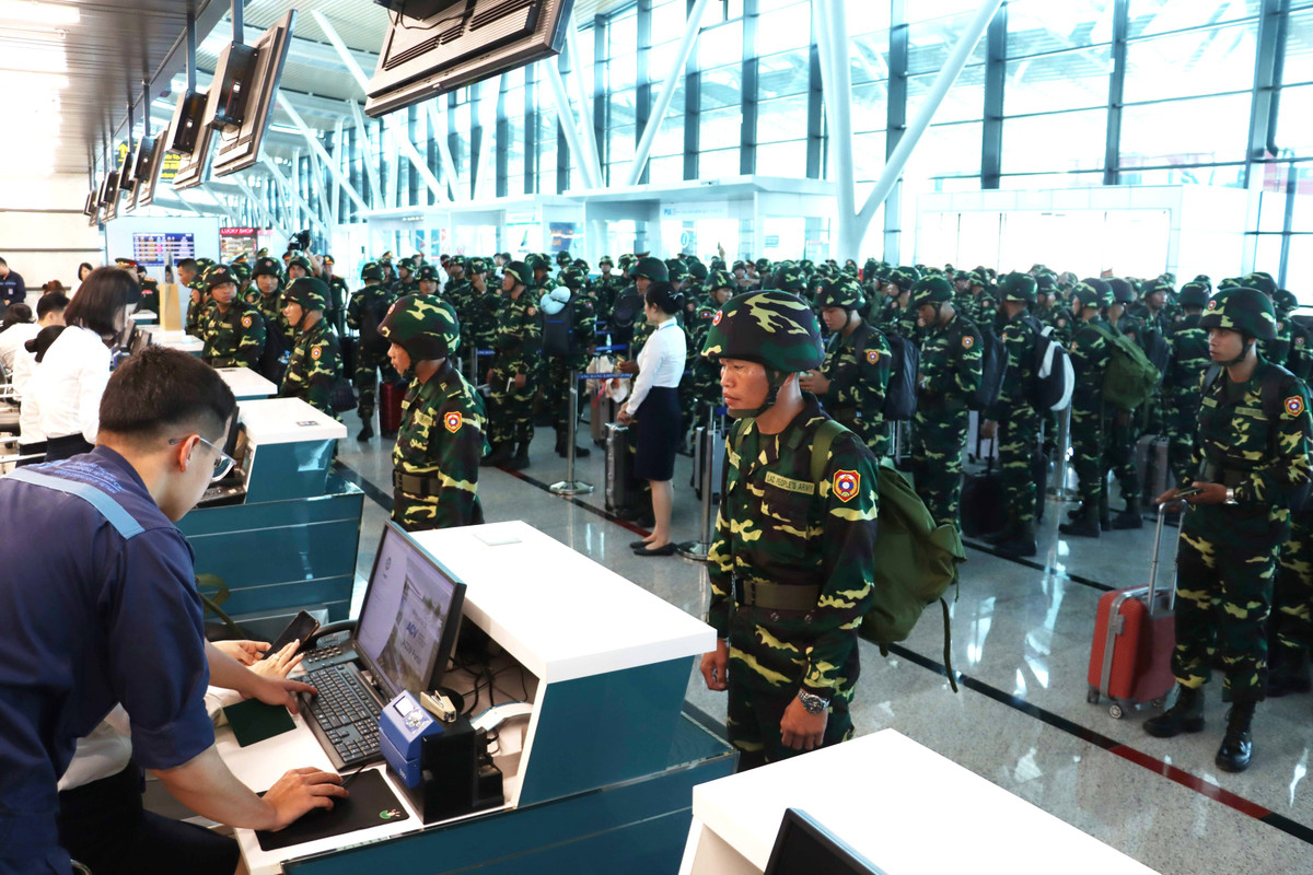 Lực lượng Quân đội nhân dân Lào sang Việt Nam sang tham gia diễu binh, diễu hành dịp 30/4 đang làm thủ tục để bay từ Huế vào TP.HCM.