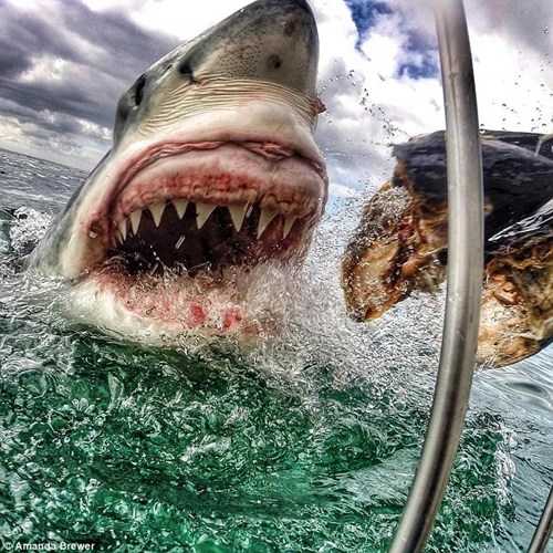 Cô giáo Amanda Brewer dũng cảm giáp mặt cá mập trắng và ghi lại những hình ảnh rợn người về hàm răng sắc lạnh của con vật.(Theo Kiến thức)