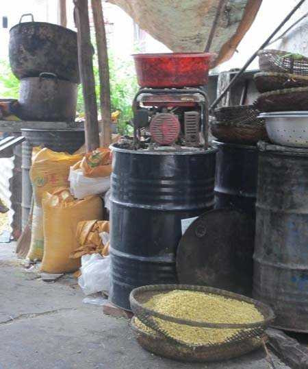 Mọi dụng cụ đều cáu bẩn, dơ dáy, ngô nguyên liệu được để thẳng xuống nền đất bẩn