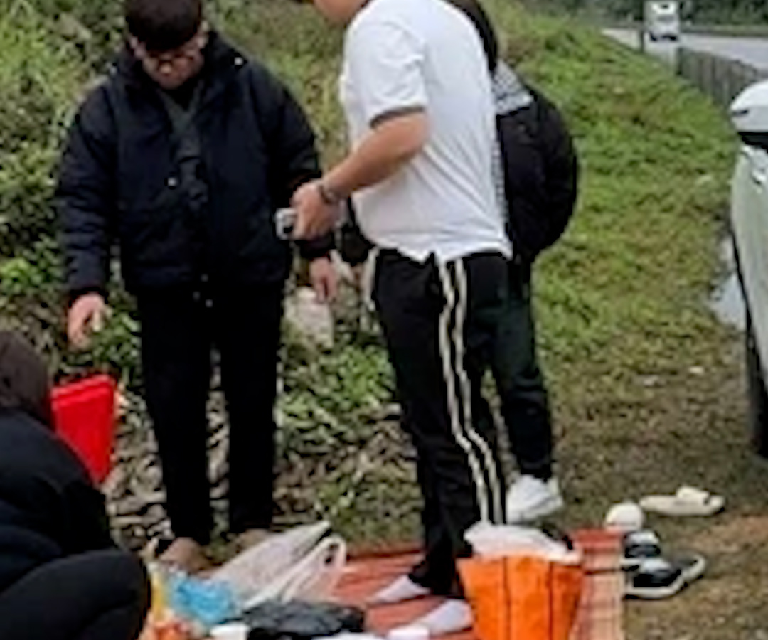 Hình ảnh tài xế dừng ô tô trên cao tốc để cả nhà trải chiếu ngồi ăn cơm
