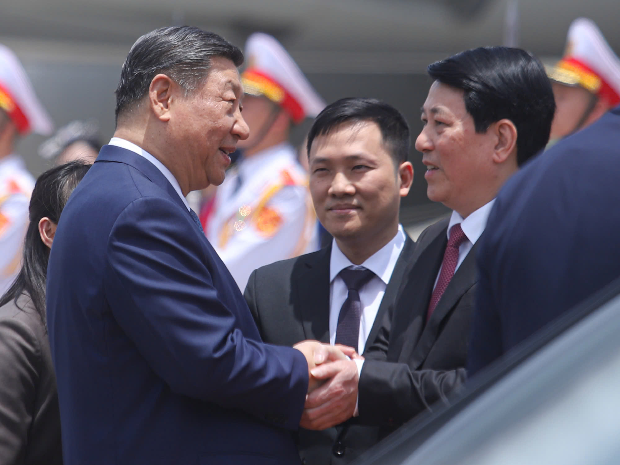 Chủ tịch nước Lương Cường ra sân bay quốc tế Nội Bài đón Tổng Bí thư, Chủ tịch nước Tập Cận Bình và Đoàn đại biểu cấp cao Trung Quốc. Cùng đoàn tiếp đón có Ủy viên Bộ Chính trị, Bí thư Trung ương Đảng, Thường trực Ban Bí thư Trần Cẩm Tú; Bí thư Trung ương Đảng, Chánh Văn phòng Trung ương Đảng Lê Hoài Trung; Ủy viên Trung ương Đảng, Chủ tịch Ủy ban nhân dân thành phố Hà Nội Trần Sỹ Thanh; Ủy viên dự khuyết TW Đảng, Thứ trưởng Thường trực Bộ Ngoại giao Nguyễn Minh Vũ; Đại sứ Việt Nam tại Trung Quốc Phạm Thanh Bình.