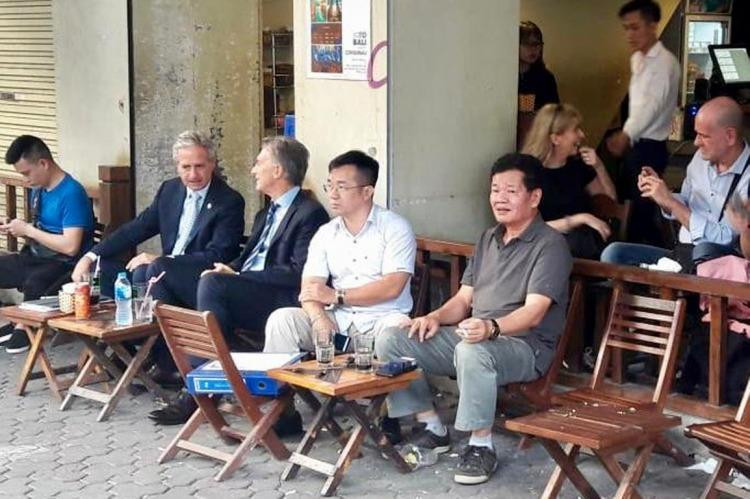 Tổng thống Argentina uống nước ở quán cà phê vỉa hè Hà Nội. (Ảnh: Politic Argentina)