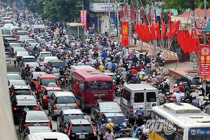 Hàng dài các phương tiện chen chân nhích từng cm qua ‘ngã tư đau khổ nhất Thủ đô’.