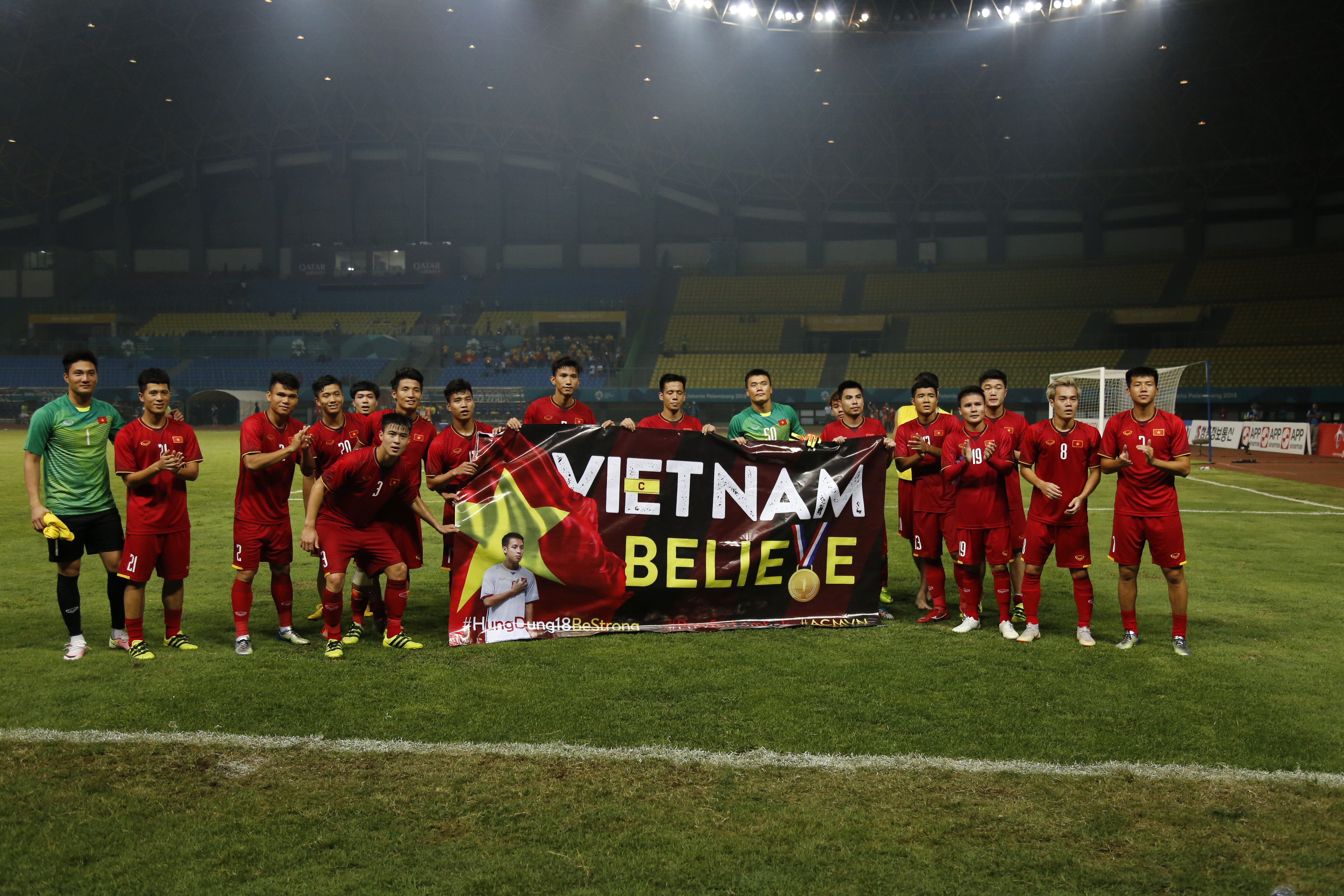 Sau trận đấu, như thường lệ, các cầu thủ Olympic Việt Nam tiến lại khán đài cảm ơn cổ động viên. Đội trưởng Văn Quyết ra hiệu nhờ lấy một lá cờ cổ động treo trên hàng rào xuống.