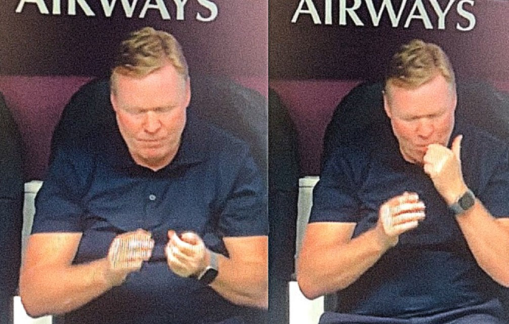Trên mạng xã hội, CĐV chia sẻ khoảnh khắc HLV Ronald Koeman tỏ rõ sự sốt ruột trên băng ghế chỉ đạo, khi chứng kiến học trò thi đấu bế tắc. Cựu thuyền trưởng Barcelona đưa tay ngoái mũi dẫn đến chảy máu. Ngay lập tức, Koeman mút ngón tay rồi tiếp tục ra sát đường biên để chỉ đạo học trò.