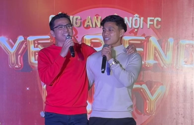 Tại buổi tiệc tất niên của CLB Công an Hà Nội, HLV Kiatisak cùng Vũ Văn Thanh khoác vai hát bài "Nắm lấy tay anh".