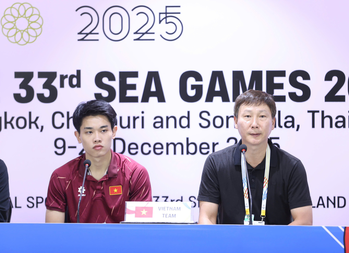 Huấn luyện viên Kim Sang-sik và tiền đạo Nguyễn Đình Bắc trong buổi họp báo sau trận bán kết SEA Games 33.