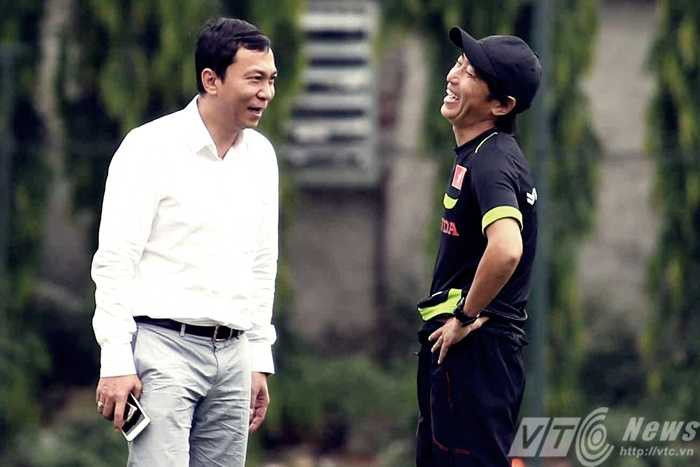 Chiến lược gia 52 tuổi cười thả ga khi trò chuyện cùng Phó Chủ tịch VFF Trần Quốc Tuấn (Ảnh: Quang Minh)