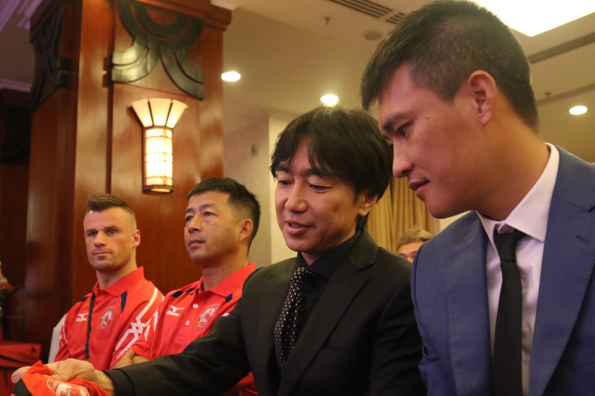 Quyền chủ tịch Lê Công Vinh và HLV Miura trong lễ ra mắt. (Ảnh: Hoàng Tùng)