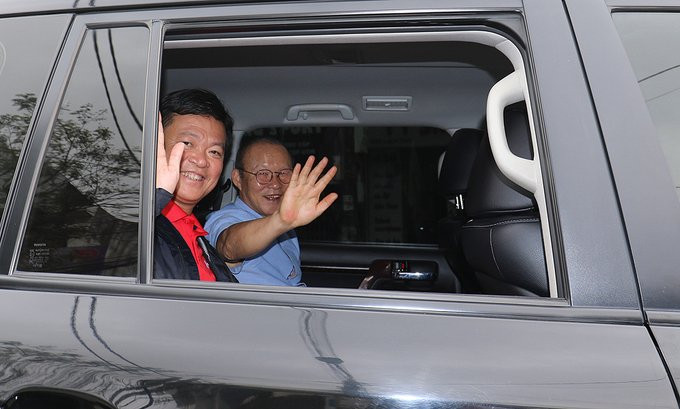 HLV Park Hang Seo ngồi trong chiếc xe màu đen, bất ngờ hòa vào dòng người diễu hành.