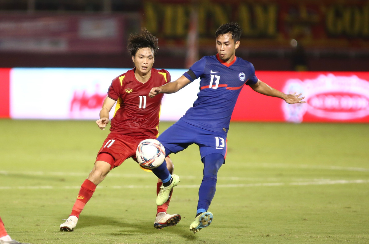 Tuyển Việt Nam (áo đỏ) thắng đậm Singapore trong thế trận áp đảo. (Ảnh: Hồng Nam)