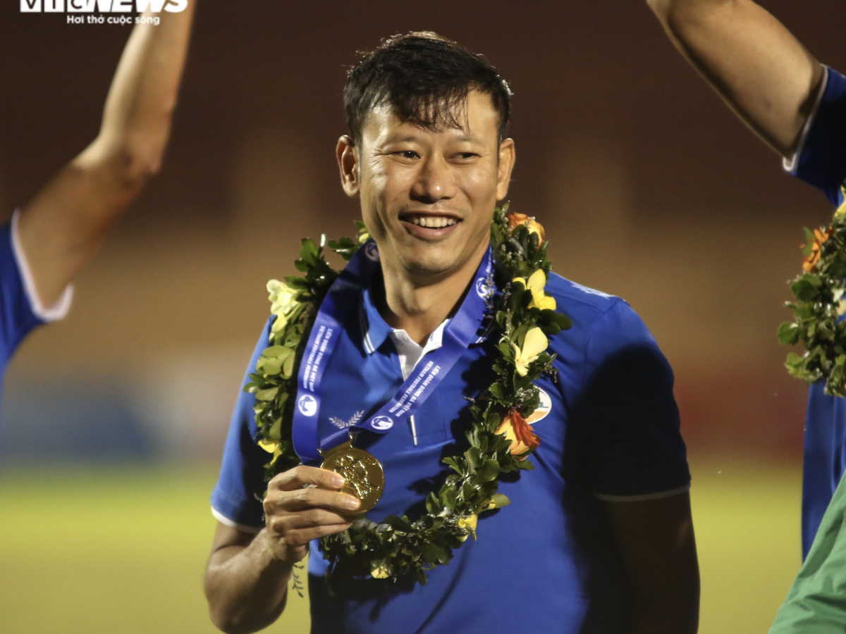 HLV Thạch Bảo Khanh phấn khích với huy chương vàng đầu tiên trong nghiệp cầm quân. Đây sẽ là cú hích cho cựu danh thủ Thể Công trên chặng đường sắp tới. (Ảnh: Hồng Nam)