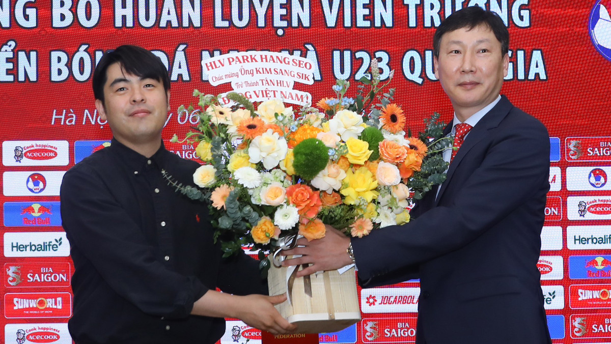 HLV Kim Sang-sik nhận lẵng hoa chúc mừng của ông Park Hang Seo gửi đến. (Ảnh: Kim Chi)