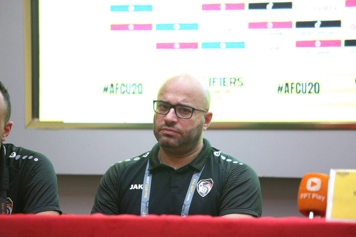 HLV Mohamad Akil và tiền đạo Mohammad Almustafa tại họp báo sau trận U20 Syria thắng U20 Guam.