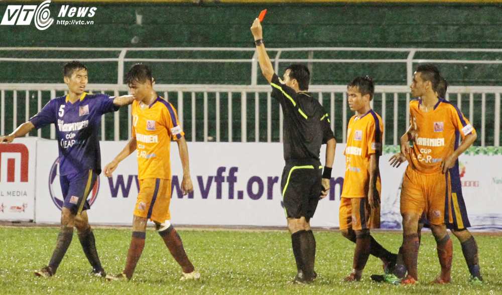 | Hồ Ngọc Thắng nhận thẻ đỏ rời sân vì lỗi đánh nguội (Ảnh: Hoàng Tùng) |