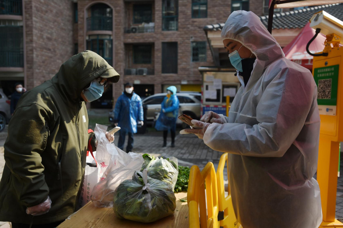 Người dân mua rau tại lối vào một khu dân cư ở Vũ Hán, tâm chấn của Covid-19, tỉnh Hồ Bắc, Trung Quốc ngày 21/2/2020. (Ảnh: Reuters)