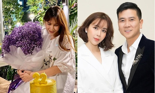 Giọng ca Đừng ngoảnh lại chỉ chia sẻ duy nhất một hình ảnh. Cô nở nụ cười hạnh phúc, ôm bó hoa được ông xã tặng, đặc biệt gây chú ý là chiếc bánh kem với dòng chữ: "Happy Birthday vợ yêu".