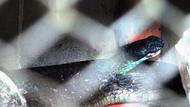 Con hổ mang chúa nặng hơn 6 kg, dài 3,1 m bị xuyên dây thép khâu miệng, thân bỏng do người dân chích điện đang được chăm sóc với chế độ đặc biệt. (Theo Zing)