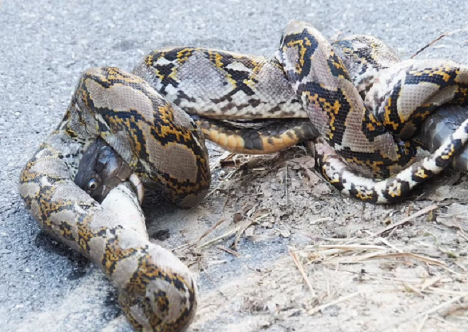 Trong trường hợp này, con rắn chịu đựng đủ lâu để nọc độc của nó đoạt mạng con trăn hung dữ. Đợi cho tới khi kẻ thù chết hẳn, con rắn bắt đầu xẻ thịt bữa trưa của mình.