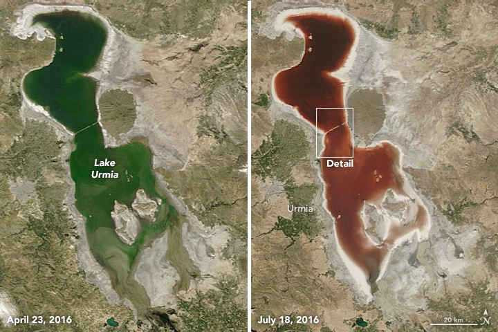 Gần đây, các hình ảnh vệ tinh chụp Hồ Urmia, Iran cho thấy hồ vốn dĩ mang màu xanh nay bỗng nhiên chuyển sang màu đỏ máu.