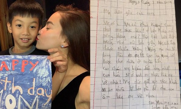 Ngày mai con đi Long Hải rồi. Con hy vọng sẽ được chơi nhiều ở ngoài biển. Con chúc mẹ biểu diễn hay nhé! Con hứa sẽ ở với mẹ nhiều khi mẹ về nhà. Mẹ nhớ giữ gìn sức khỏe và ăn nhiều để béo phì để con ôm lúc mẹ về nha" - Subeo viết. Không chỉ vậy, cậu nhóc còn để lại một lời nhắn cực kì ngọt ngào: "Con yêu mẹ. Subeo của mẹ".