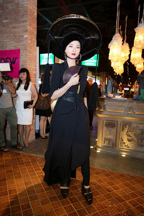 | Ngô Thanh Vân luôn trung thành với phong cách thời trang tối giản. Tuy nhiên, trong đêm khai mạc Tuần lễ Nhà thiết kế thời trang Việt Nam Xuân/Hè 2016, cô phá lệ, chọn bộ trang phục cầu kỳ của NTK Kelly Bùi. Điểm nhấn của trang phục sự kết hợp giữa những món đồ quen thuộc của phụ nữ Bắc bộ - chiếc nón quai thao và khăn mỏ quạ |