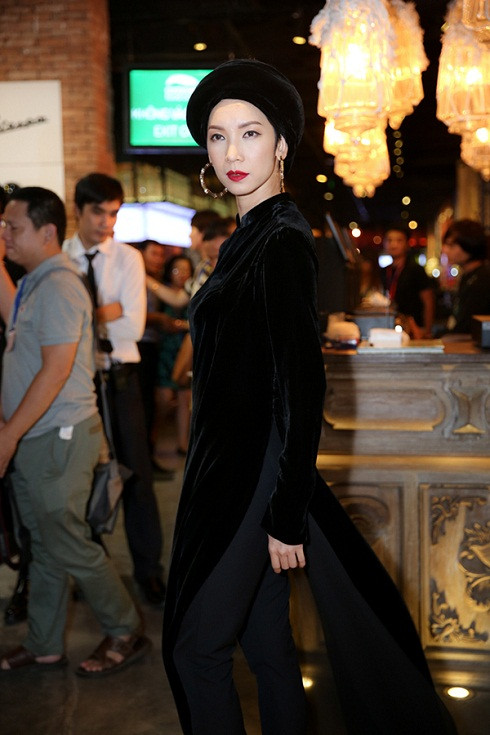 | Xuân Lan bí ẩn và quý phái trong bộ áo dài nhung nhung đen của NTK Kelly Bùi. |