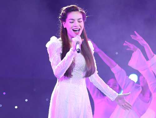 Tối 28/8, Hồ Ngọc Hà tham gia chương trình 'Câu chuyện hòa bình' tại Nhà hát Hòa Bình, TP HCM. Đây là chương trình mang ý nghĩa xã hội, góp phần giáo dục giới trẻ về tinh thần yêu nước. Xuất hiện ở giữa đêm nhạc, Hồ Ngọc Hà được tán thưởng nồng nhiệt khi mặc áo dài trắng thướt tha với họa tiết hoa.