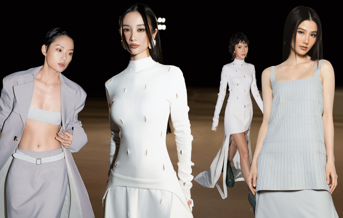 Hoa hậu Kỳ Duyên và siêu mẫu Minh Triệu ton sur ton dạo phố với áo dài có phần tay và vạt xẻ tựa áo dài truyền thống, nhưng lại làm từ chất liệu dệt kim (jersey knit). Chi tiết vạt áo xéo, xẻ cut-out một bên vai tăng tính thời thượng cho trang phục. Áo dài là thiết kế tiêu biểu trong BST mùa lễ hội của Cường Đàm.