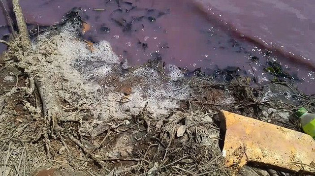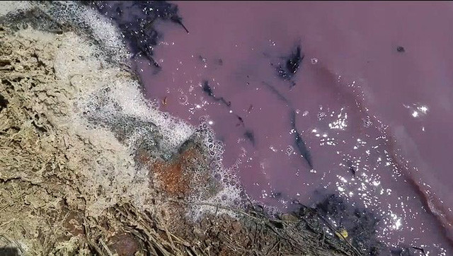 Có mặt tại hồ chứa nước rộng khoảng 10ha, chúng tôi nhận thấy nước trong hồ chuyển thành màu hồng tím, thậm chí dòng nước hồng tím này còn chảy qua cống số 6, tràn sang một khúc sông, nơi đang có dân cư sinh sống.