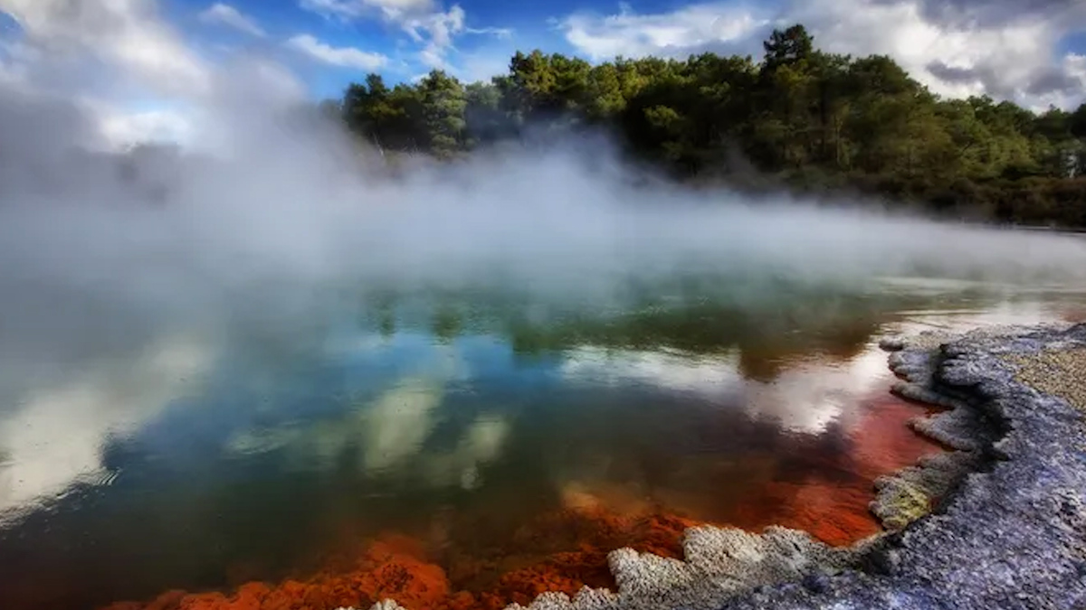 Hồ nước nóng có tên Champagne nằm trong khu vực địa nhiệt Waiotapu ở Đảo Bắc, New Zealand có nhiệt độ nước lên tới 260 độ C khiến nước sôi sủi bọt.