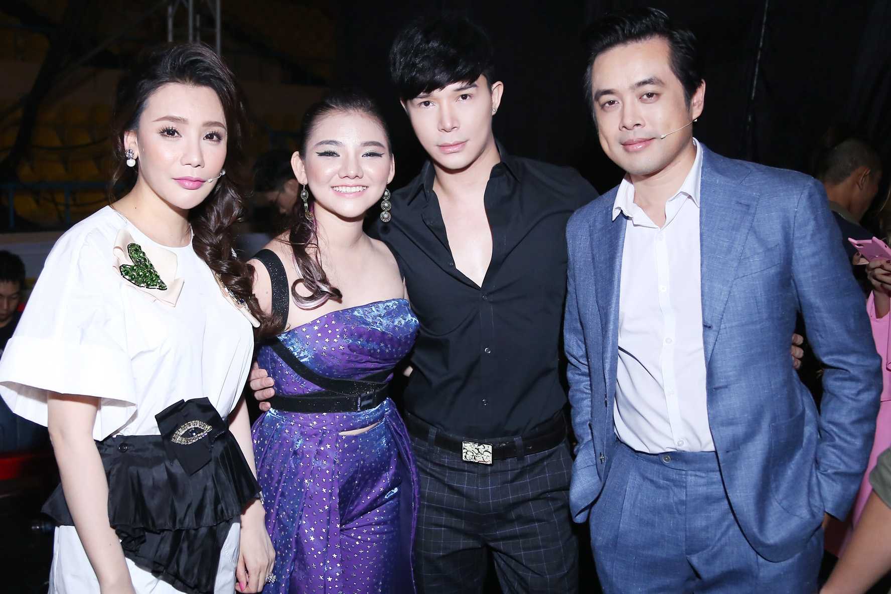 Minh Như bên cạnh giám khảo Hồ Quỳnh Hương, nhạc sỹ Dương Khắc Linh và cố vấn Nathan Lee