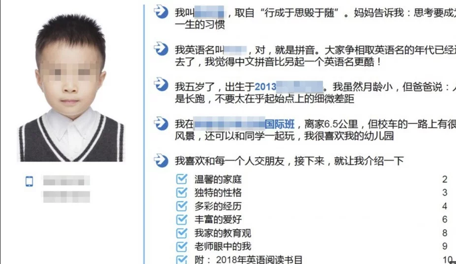 Tháng 4/2018, hồ sơ của một em bé 6 tuổi được chọn từ 8.000 ứng viên vào 1 trong 60 chỗ tại một trường tiểu học tư cao cấp cũng gây sốt trên mạng Trung Quốc. Theo hồ sơ này, đứa trẻ đã học nói từ 3 tháng tuổi và bắt đầu học lập trình từ 5 tuổi. Hồ sơ cũng bao gồm thông tin sự nghiệp của bố mẹ em nhỏ trong lĩnh vực học thuật và kỹ thuật, cho biết em nhỏ này nhận diện được hơn 2.000 ký tự Trung Quốc, đã giành được nhiều giải vô địch toán học, đã học chơi cờ tướng và bơi ở tuổi lên 3.